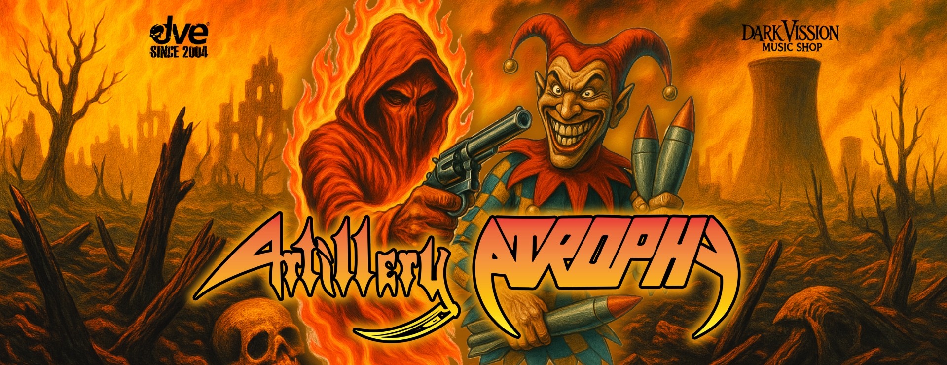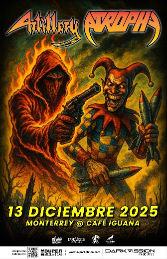 Una aplastante y furiosa onda sonora arrasará el CAFE IGUANA con la llegada de 𝐀𝐫𝐭𝐢𝐥𝐥𝐞𝐫𝐲 (Dinamarca) y 𝐀𝐭𝐫𝐨𝐩𝐡𝐲 (Estados Unidos), dos monstruos del thrash metal vieja escuela que prometen derribar todo a su paso con la letal ejecución de sus temas más clásicos.